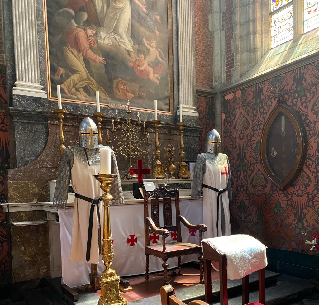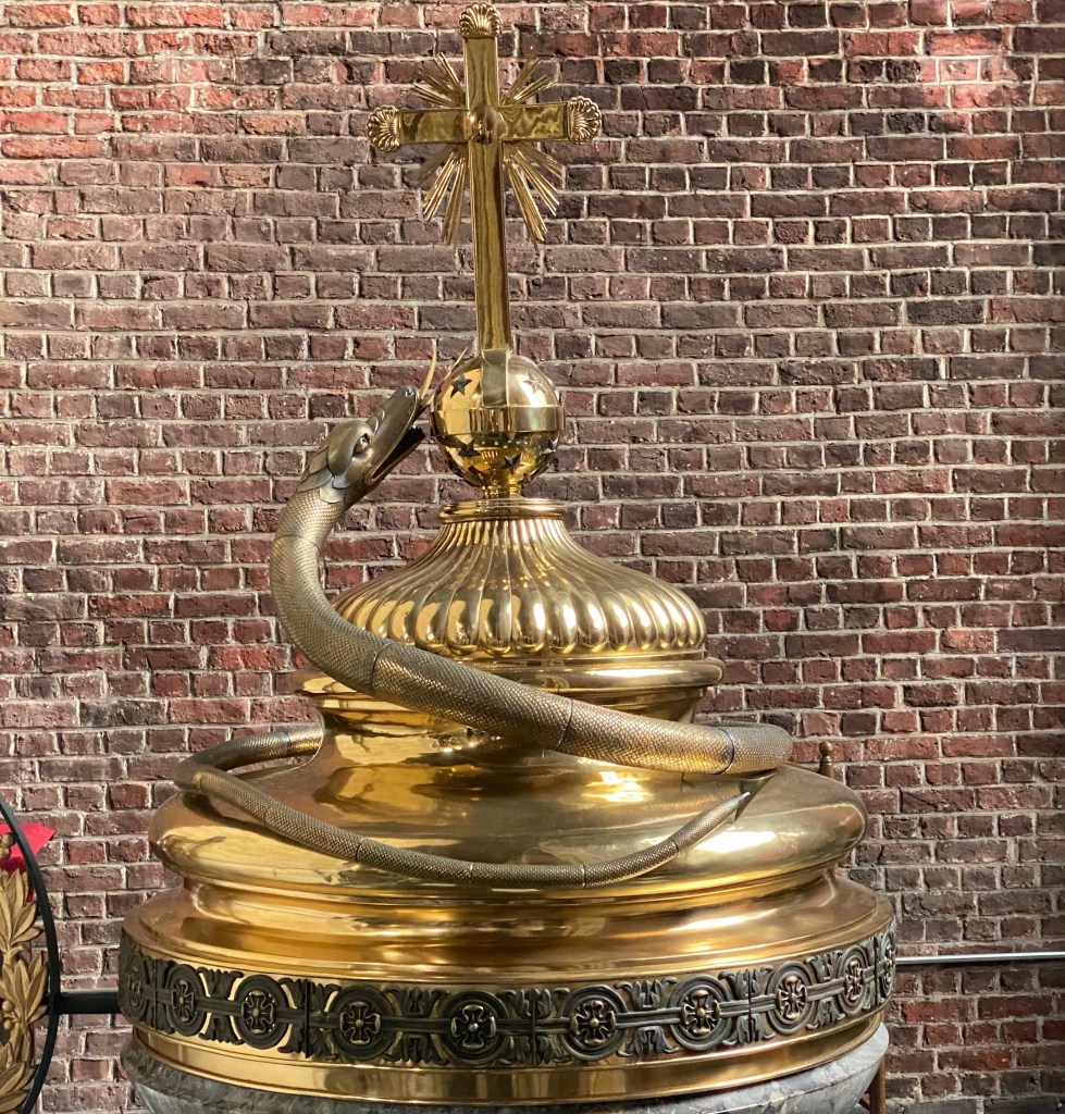 Les templiers n’en sont pas vraiment: il s’agit de chevaliers de l’ordre des Rose Croix, continuation des vrais templiers, créée en 1317 et qui a prospéré à Gand. On a eu l’impression de se retrouver dans un livre de Umberot Éco, ce qui n’a pas nui du tout à notre enthousiasme pour cette église. Les fonds baptismaux très particuliers ont fini de nous charmé (il y a un serpent enroulé autour) : Sint-Michielskerk est vraiment magnifique et passionnante.