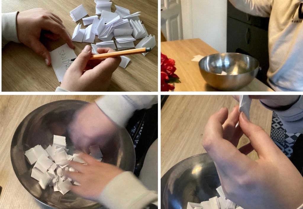 Wizzboy, très content de son importance, a préparé 27 petits papiers de tailles identiques, a recopié les inscriptions et les a pliés consciencieusement en petits carrés. Il les a mis dans un saladier, a touillé avec énergie, a remis dedans ceux qu’il a fait voler en touillant, a retouillé mais moins fort et après avoir fait un roulement de tambour vocal, il a enfin sorti un papier, triomphalement.