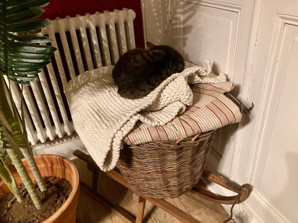 Capucine a trouvé un coin parfait pour passer l’hiver, près d’un radiateur et sur un coussin, plus ou moins cachée à la vue de Marcel qui est bien trop joueur et excité pour elle.