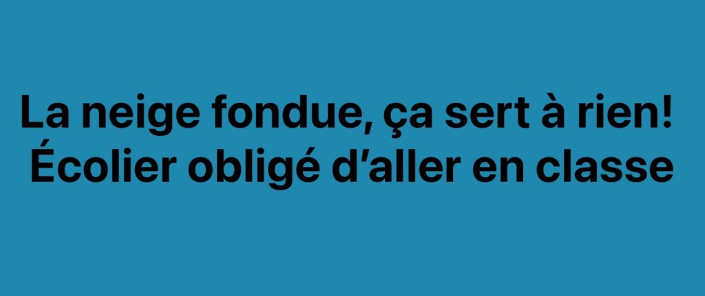 Après trois jours sans école à cause de la météo, les cours ont repris lundi matin, alors que la neige finissait de fondre. Ça n’a pas plu à tout le monde, dont Wizzboy et surtout un de ses camarades, qui râlait devant le portail de l’école. Cet enfant a tout à fait raison quand il dit: