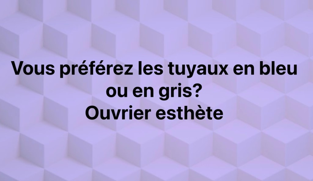 Euh…on est bien d’accord, ces tuyaux, ils restent à la cave? On ne les verra pas tous les jours non plus…ça n’a pas arrêté l’ouvrier qui a insisté, avec ses deux échantillons de plastique coloré. Maricheri a voulu faire preuve de bonne volonté et il a fait semblant de s’intéresser: C’est quoi la différence entre les deux exactement? Alors celui-là, il est bleu et l’autre, il est gris. En effet. On a pris la décision de le laisser choisir, en faisant confiance à son opinion de professionnel. Il a eu l’air content et il nous a appelé depuis la cave quelques heures plus tard pour qu’on vienne admirer les nouveaux tuyaux qui sont bleus. Voilà.