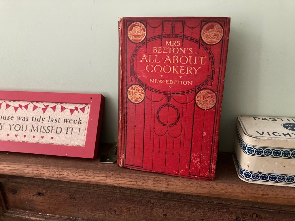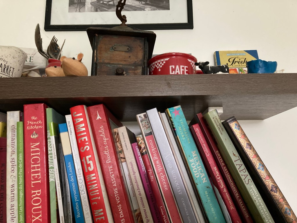 Aaaah, j’en ai plein! En anglais, en français, en espagnol et même un en italien (que je ne parle pas), offert par L’Adulte. J’ai des vieux livres (une édition de 1907 de Mrs Beeton’s, une reedition d’Escoffier), des neufs, des exotiques, des historiques (la cuisine de la Rome antique, très petit succès auprès de mes enfants, alors que les recettes médiévales ont plu), des à thèmes (les recettes chez Jane Austen ou chez Monet)…bref, j’adore les livres de cuisine.