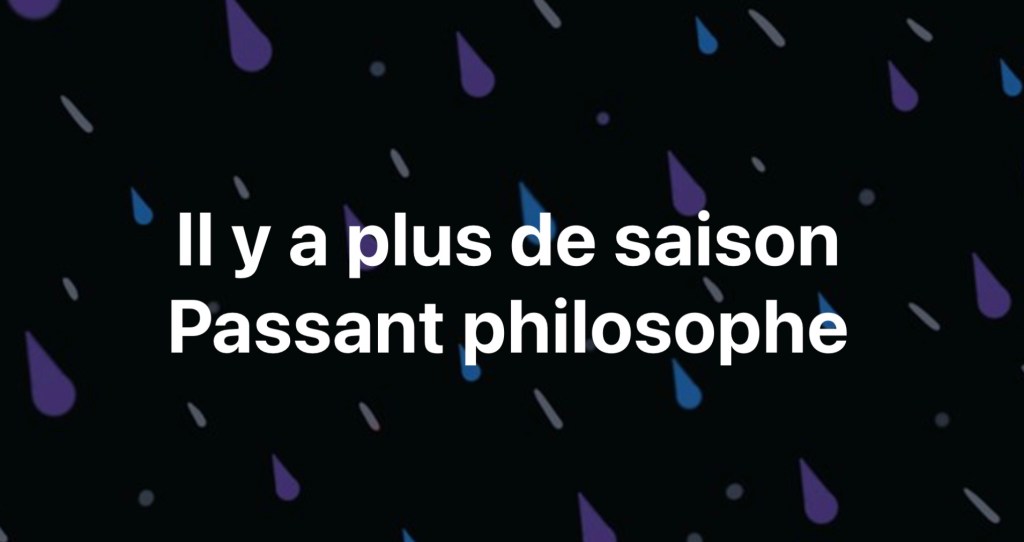 Je me suis mordue la langue pour ne pas rajouter « ma bonne dame », il se serait sûrement vexer et son interlocuteur aussi. Sérieusement, ça m’a beaucoup plu, je ne pensais pas l’entendre « en vrai », cette phrase! Ça m’a mis en joie pour le reste de la journée, il m’en faut peu. Je ne me moque absolument pas, je suis vraiment ravie d’avoir enfin entendu « il n’y a plus de saison » dans une véritable discussion et je regrette juste de ne pas m’être arrêtée, si ça se trouve l’autre a peut être répondu « mon bon monsieur » et je l’ai manqué!