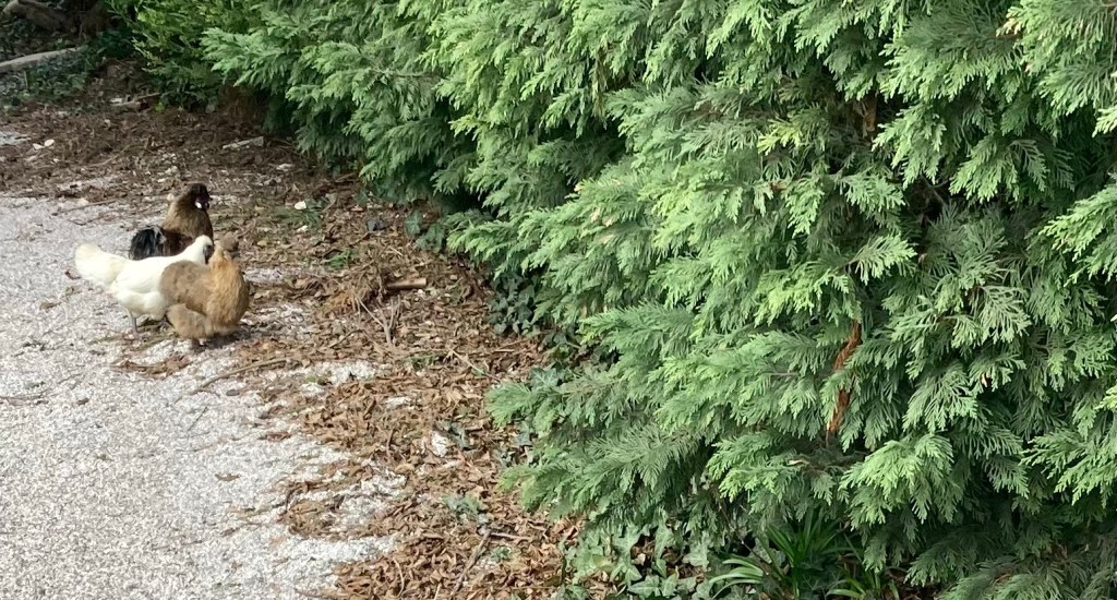 Pic: réunion au sommet pour décider de l’envahissement ou non de la haie. Imogene est partie en éclaireur, les autres attendent son rapport.