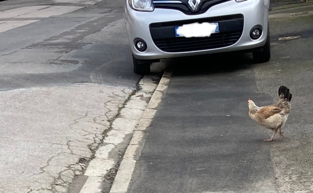 En allant à une réunion à la mairie, j’ai croisé une poule qui attendait pour traverser la rue. J’aime bien mon village!
