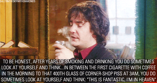 « Honnêtement, après des années à fumer et à boire, parfois, tu te regardes et tu penses…entre la première cigarette avec le café du matin et le 400ème verre de vinasse pourrie à trois heures du mat, tu te regardes et tu penses : c’est fantastiques, je suis au paradis! »