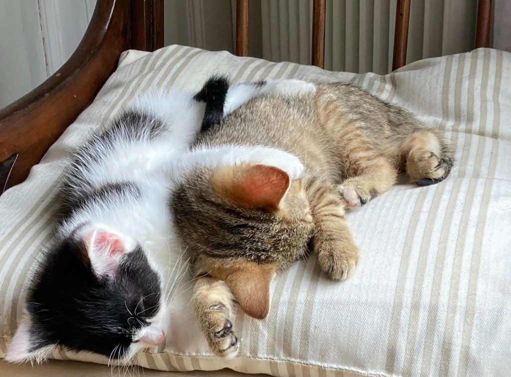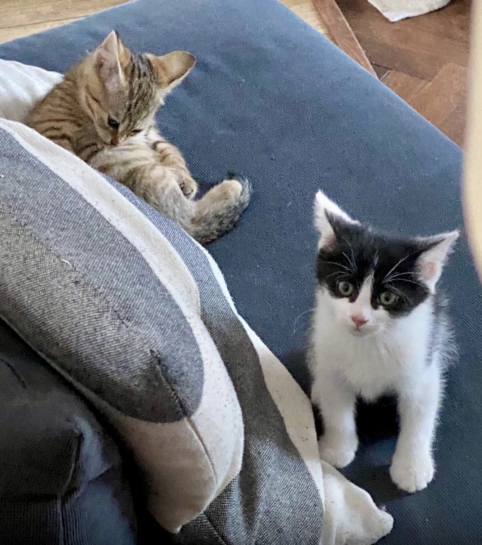 Voilà comment il y a une dizaine de jours, deux nouveaux chatons tout neufs ont débarqué chez nous. Les enfants les ont rebaptisés Albert et Abigail. Après des débuts hésitants, Albert n’est pas du tout craintif, peureux, récalcitrant ou idiot. Il est juste un chouïa plus calme que Abigail, mais elle n’a pas mis la barre très haut. Il est même plus câlin et adore dormir sur les humains. Les chatons sont en admiration béate devant Marcel. Malheureusement, ce n’est pas réciproque puisqu’il a eu très peur d’eux. Ça commence à aller mieux, mais c’est assez ridicule de voir Marcel sursauter de trouille devant ces petits machins remuants certes, mais pas plus que lui finalement.