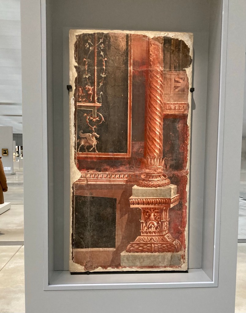 Ce n’était pas voulu, mais on a justement vu quelque chose “faux” cette semaine. Ça colle parfaitement au thème proposé par Ma’. On est allé voir la galerie du temps rénovée du Louvre Lens, avec ses quelques 250 nouvelles œuvres. C’est à dire nouvellement exposées à Lens, pas neuves, puisqu’on y trouve même une sculpture rupestre datant de 20 000 ans. J’ai choisi quelque chose de moins ancien mais tout de même antique, avec ce trompe l’œil qui vient tout droit d’Herculanum. Une fausse colonne, du faux lierre, un faux cheval (ailé qui plus est), un faux décor, mais une vraie œuvre d’art…bref, du faux comme j’aime!