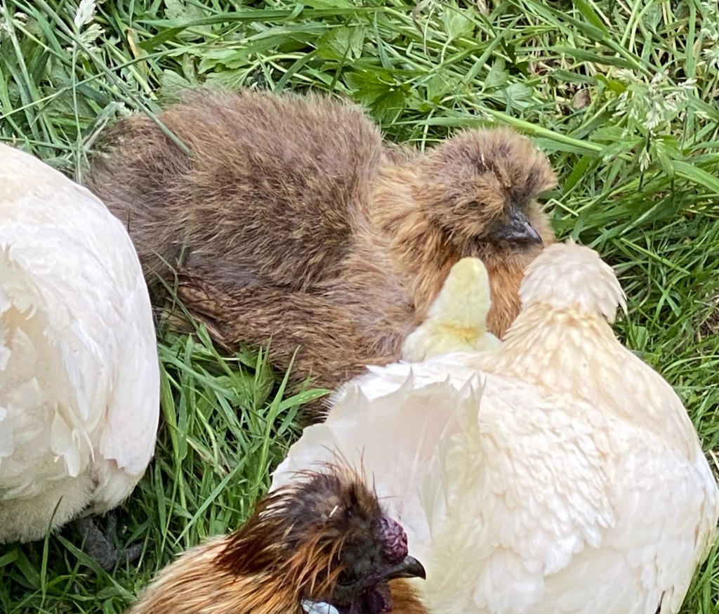 Pic: et pendant ce temps, le poussin fait sa première sortie, sous la surveillance méticuleuse de Millicent, Imogene, Philomène et Nestor. Il est cerné.
