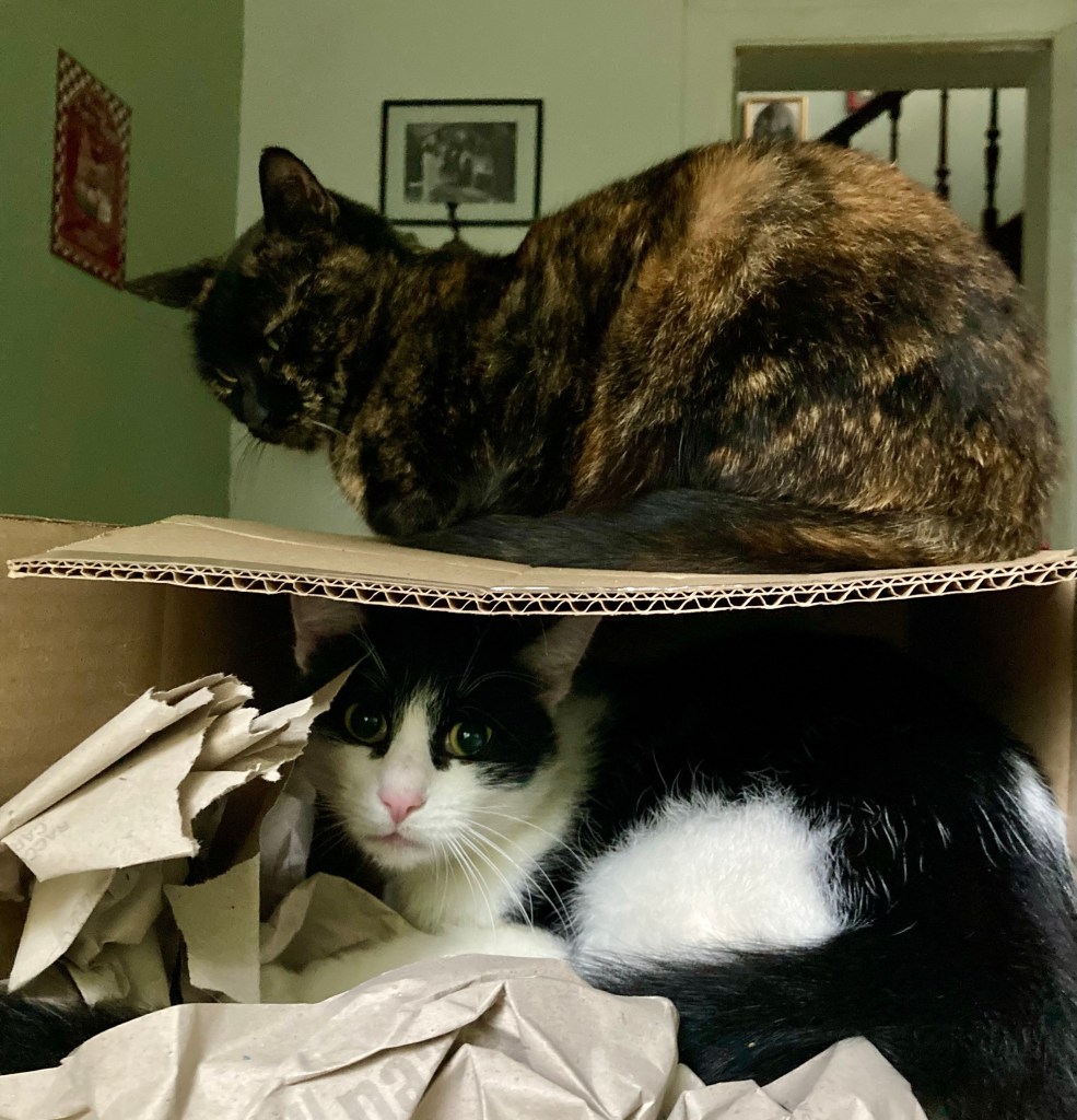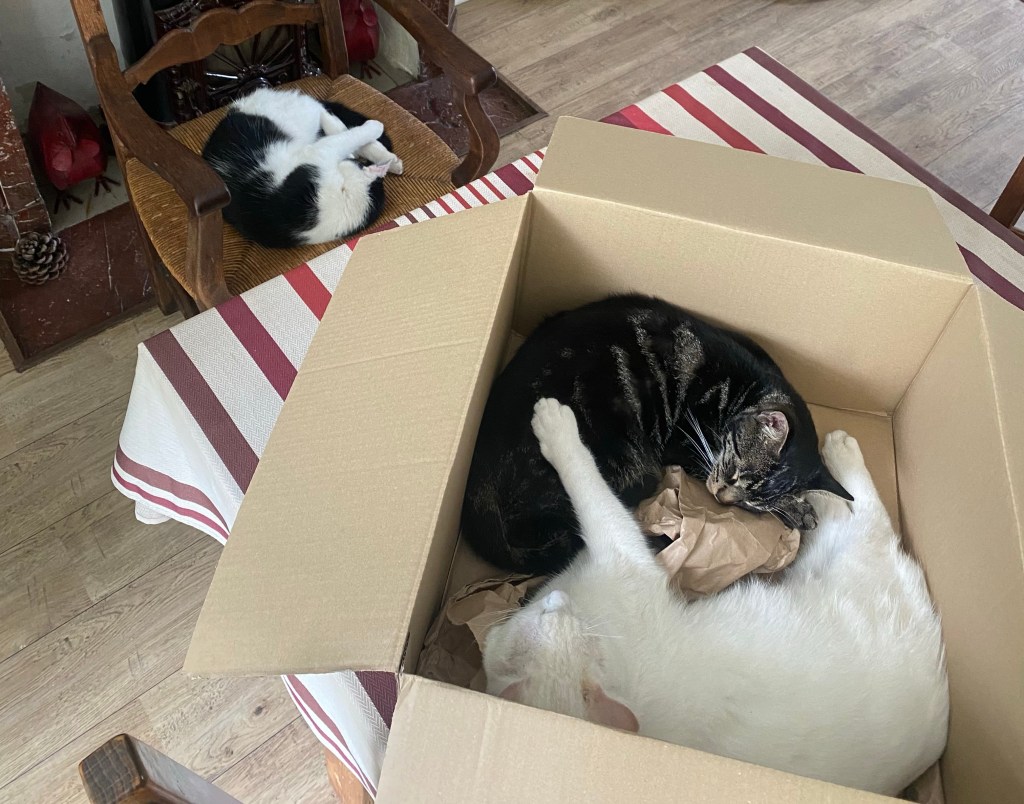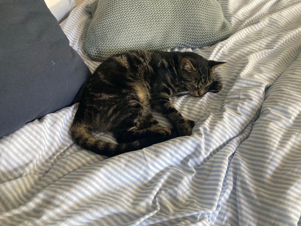 Et les chats se sont installés pour affronter la tempête du week-end, la pluie et tout ça. Ils n’avaient clairement pas l’intention de mettre un coussinet dehors dans ces conditions météo. Ils sont ressortis depuis, mais passent quand même beaucoup plus de temps à l’intérieur depuis quelques jours!