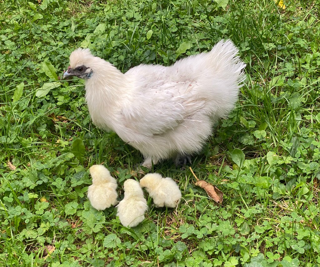 La semaine passée a commencé par l’arrivée de petits nouveaux…ça a été laborieux, Mildred, la maman qui s’était planquée dans une jardinière pour pondre, les a laissés tomber sous sa cachette. Il a fallu que Maricheri les récupère, dans un sale état, et les ressuscite en leur soufflant dessus. Quatre heures sous une lampe chauffante et ils sautaient partout. Depuis tout le monde a regagné le poulailler.